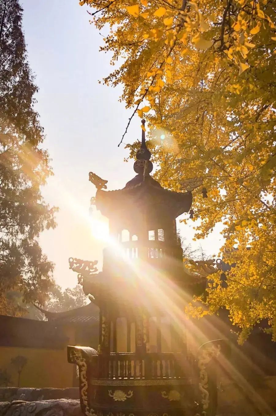 古寺秋色关不住,一地杏黄惹人怜。叶落无声秋已逝,申城尽带黄金甲。在金泽古镇的颐浩禅寺内,有一株南宋古银杏,700多年来默默地守护着千年古刹。眼下正是一年中最美之时。寺内,建筑古朴,一砖一瓦都让人感受到清幽与沉静。银杏古树与寺庙的黄墙黑瓦交相辉映,浑然一体,为深秋平添暖意。