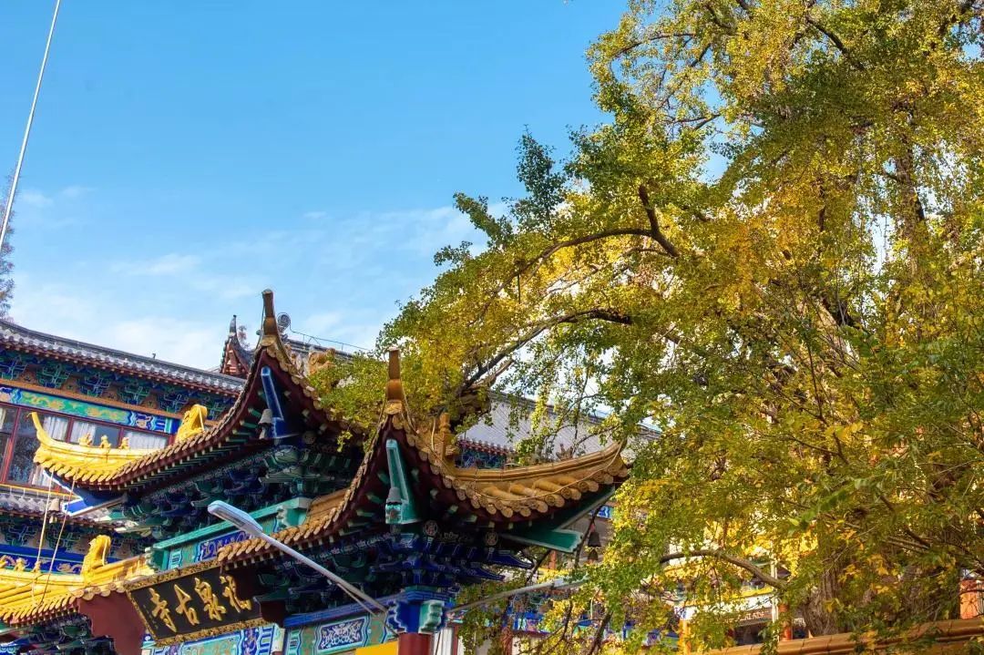 树身粗大、枝干苍劲的古银杏,小扇子一般的叶片早已披上了金黄色的风衣,在晴空之下,熠熠生辉。秋风一起,金黄色的银杏叶似蝴蝶翩翩起舞,霎时铺就一片金黄色的地毯。