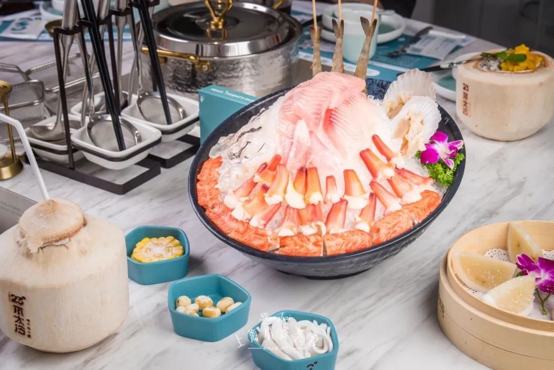 除了主打的椰子鸡锅,原味椰汁锅+泰式冬阴功的鸳鸯锅也非常受欢迎,搭配23度的宫廷肉类拼盘、海鲜拼盘都很合适!