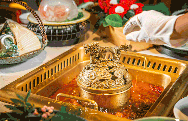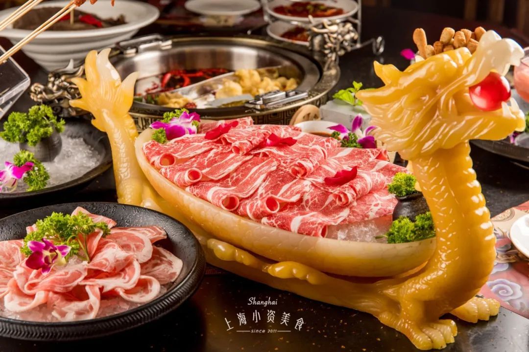 他家特制的龙锅也超有特色,五爪金龙盘旋其间,欲腾空而起,神态栩栩如生。闻着高汤香气,听着服务生中气十足的口号,揭盖而起,开吃开吃~