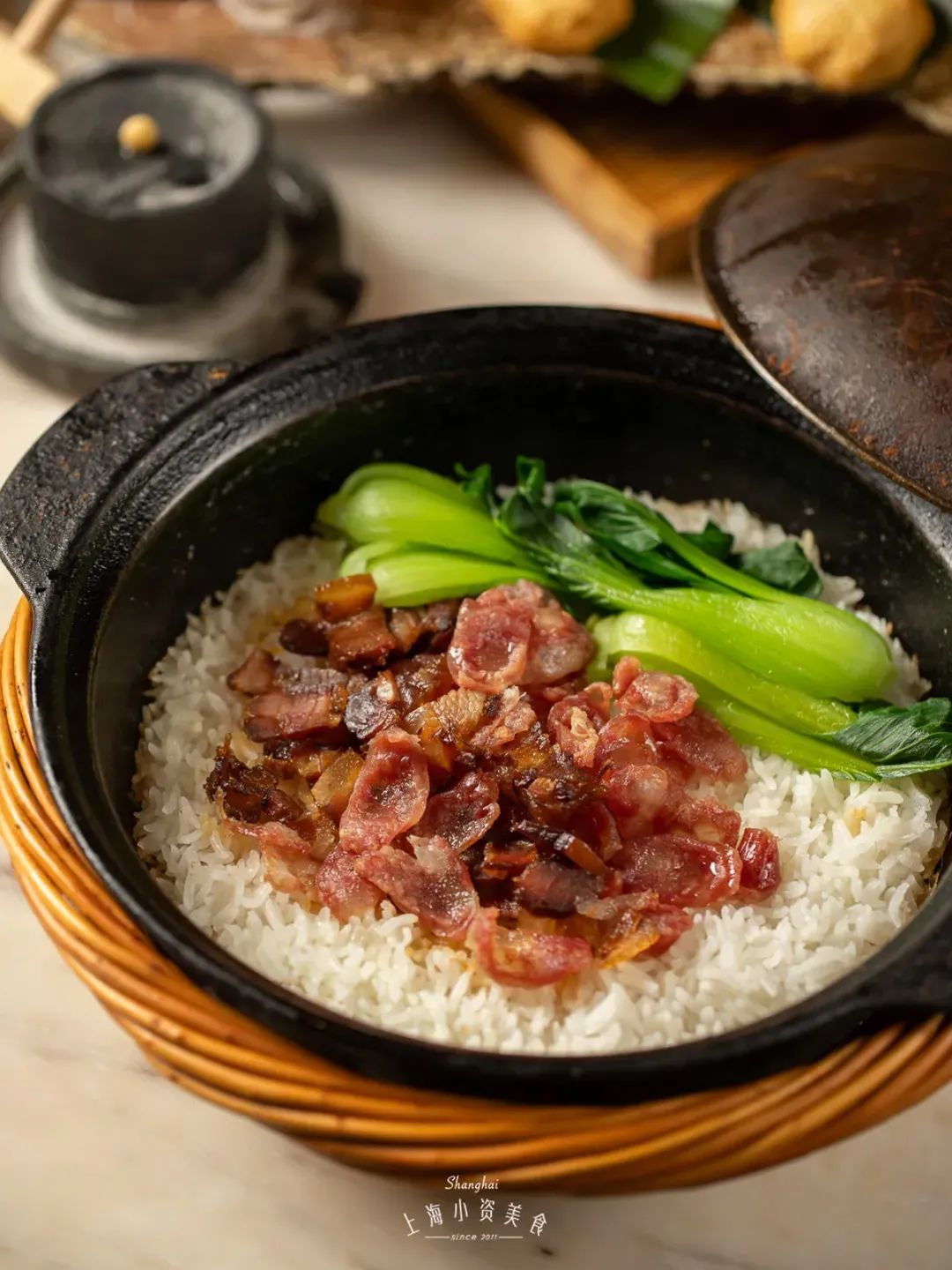 先来一份它家好评无数的煲仔饭垫垫饥!颗粒分明,带着锅巴的米饭上,铺了超多料的广式香肠,倒上秘制酱油搅拌开,油润鲜香中沁入一丝丝甜,一吃更加开胃!