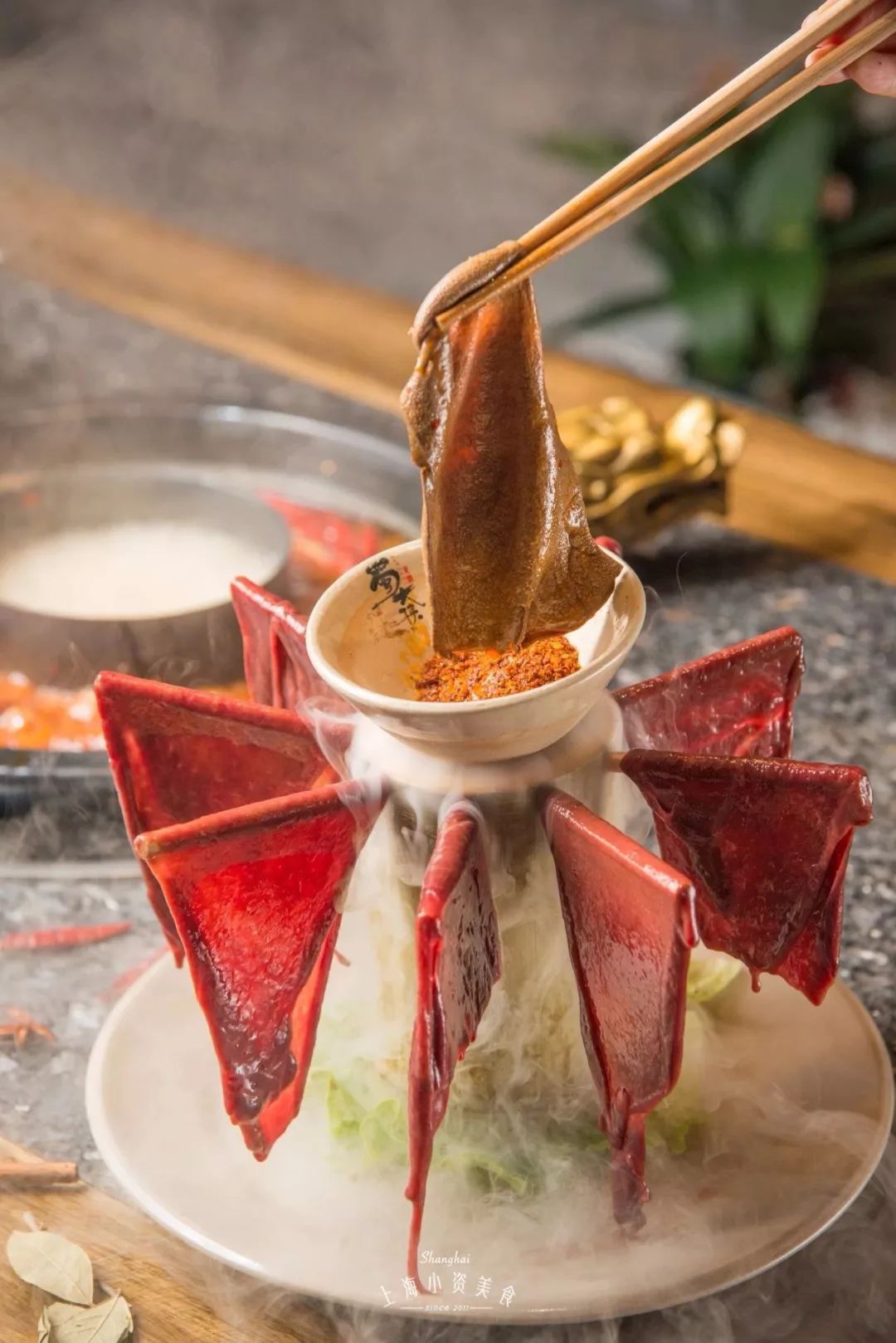 打飞的从重庆空运来的鲜毛肚,每片都有巴掌那么大,夹起来的时候就能感觉到韧性!涮个“七上八下”,鲜辣爽脆够过瘾!