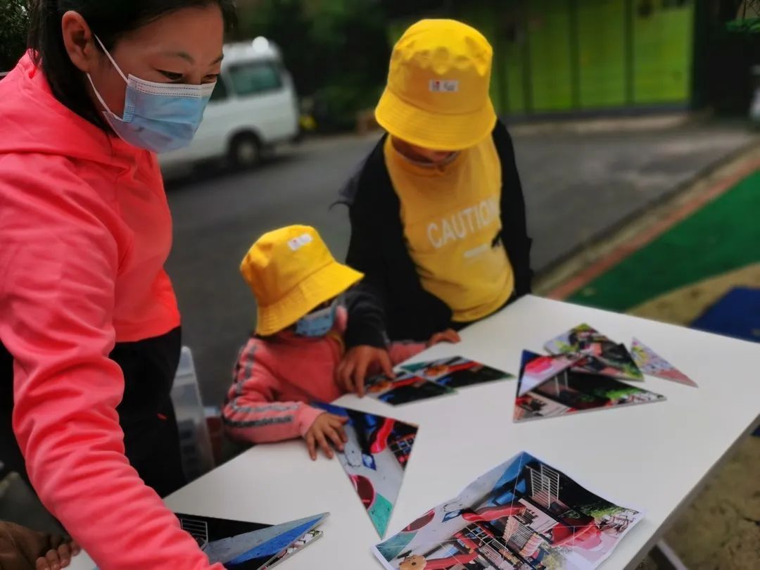 小朋友们在儿童乐园进行社区特色拼图,对社区景色更加了解。