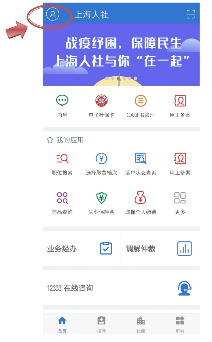 打开“上海人社”APP,点击首页左上角空白头像进行登录或注册。