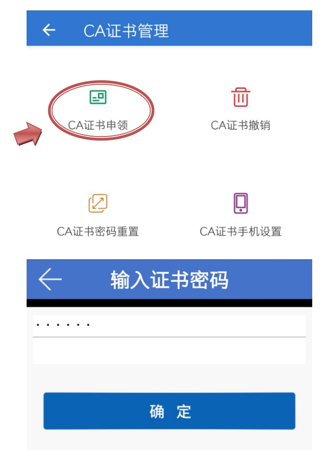 在【业务经办】模块下办理业务须先经过人社数字软证书(CA证书)认证。如已有证书,直接输入密码。如首次申领证书,可通过“CA证书管理”设置证书密码(如需验证手机,请按提示录入验证码)。