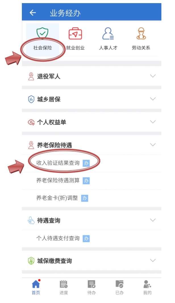 认证通过后,系统将默认显示【就业创业】板块,请点击页面左上角“社会保险”图标,进入【社会保险】板块,再点击【养老保险待遇】下的【收入验证结果查询】查询。