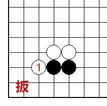 双方棋子相互靠紧时,一方从斜线上向对方兜头下一子,以阻止对方的棋子出路的着法。因扳的方向不同,有内扳、外扳、上扳、下扳之分。在一方扳时,对方还有反扳、连扳的着法。