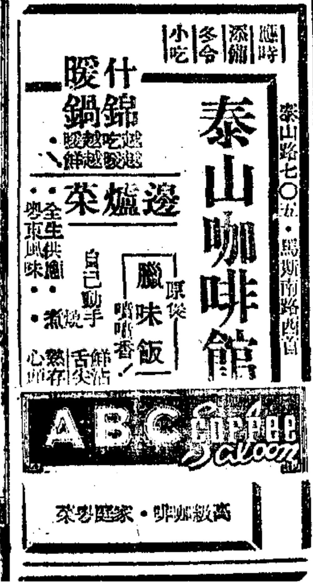 1945年12月5日《申报》刊登的泰山咖啡馆广告。这家店铺提供的餐饮服务可算是中西合璧,从高级咖啡、粤东风味、煲仔腊味饭到什锦火锅,种类多样。