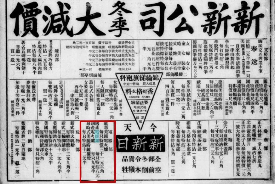 1932年11月27日《時事新報》刊登的新新公司冬季大减价广告。其中有国产及进口的电暖锅、电火炉价格。