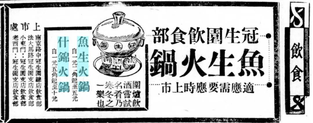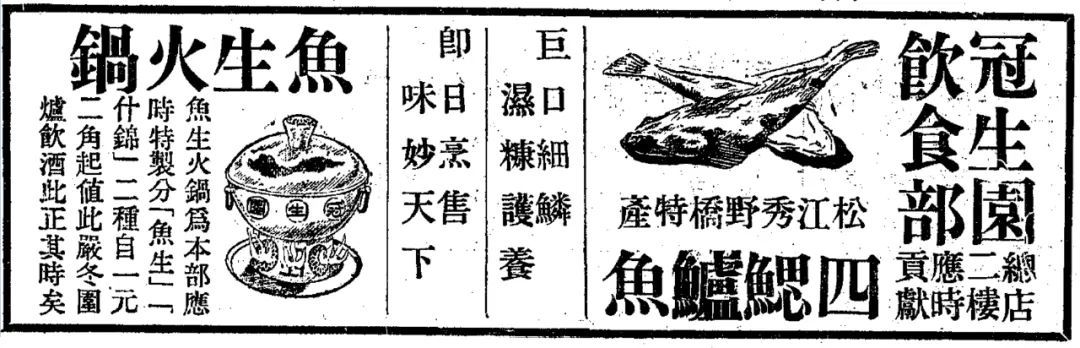 1936年12月19日《申报》刊登的冠生园饮食部四鳃鲈鱼鱼生火锅广告