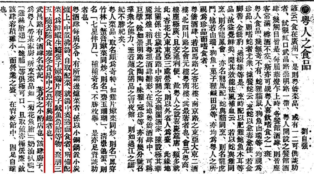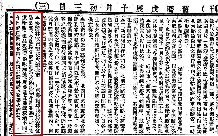1925年12月27日《申报》一则名为“粤人之食品”的报道。其中有这样的内容:“谚云(食在广州)是则粤侨菜品或有一二可供谈助者,试观虹口武昌路崇明路一带,粤人开设之餐馆酒肆几触目皆是,每届华灯乍上时,各餐馆酒肆则皆座客常满,樽酒不空,斯亦可觇粤人喜饮啫食之一斑……粤酒肆每届冬令,有所谓边炉菜者,系以小铜锅置小炭炉上,中置沸汤自取配菜,就汤中煑熟而食者,所备配菜为鲜虾、生蟾、蛋子、嫰鸡片、腰子、鱿鱼、鱼脍等物,聚朋三五,随煑随食,寒冬食品中之最有兴趣者也。”