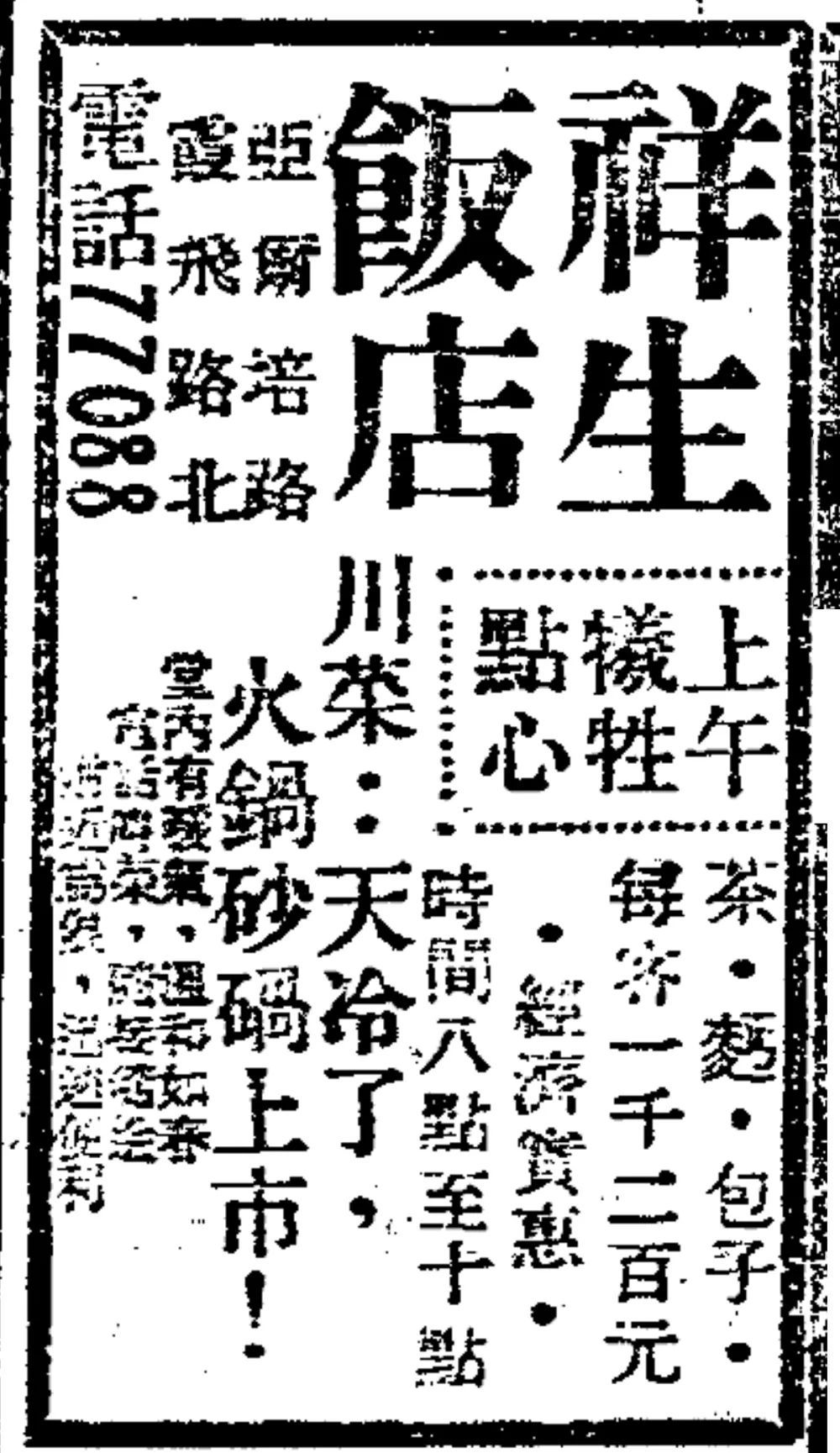 1946年12月4日《申报》刊登的祥生饭店川菜火锅的广告