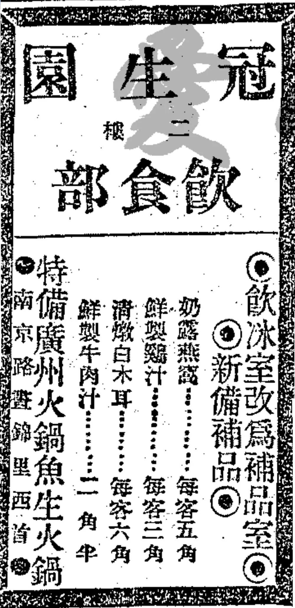 1928年12月5日《申报》刊登的冠生园饮食部广告。其中就有“特备广州火锅 鱼生火锅”