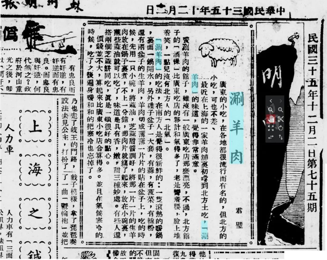 在一份20世纪40年代的报纸上寻到一篇描写在上海吃“涮羊肉”的食记,其中细节颇为有趣。