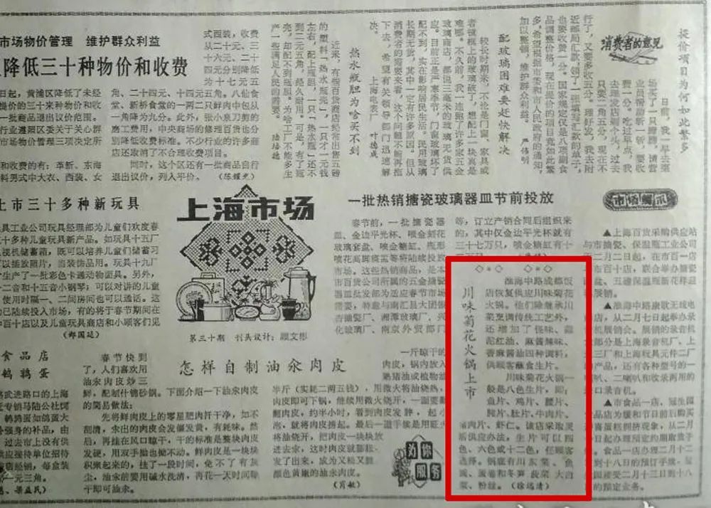 1980年2月2日《解放日报》“上海市场”版面中有一则“川味菊花火锅上市”的消息。其中也提到了“八色生片”。