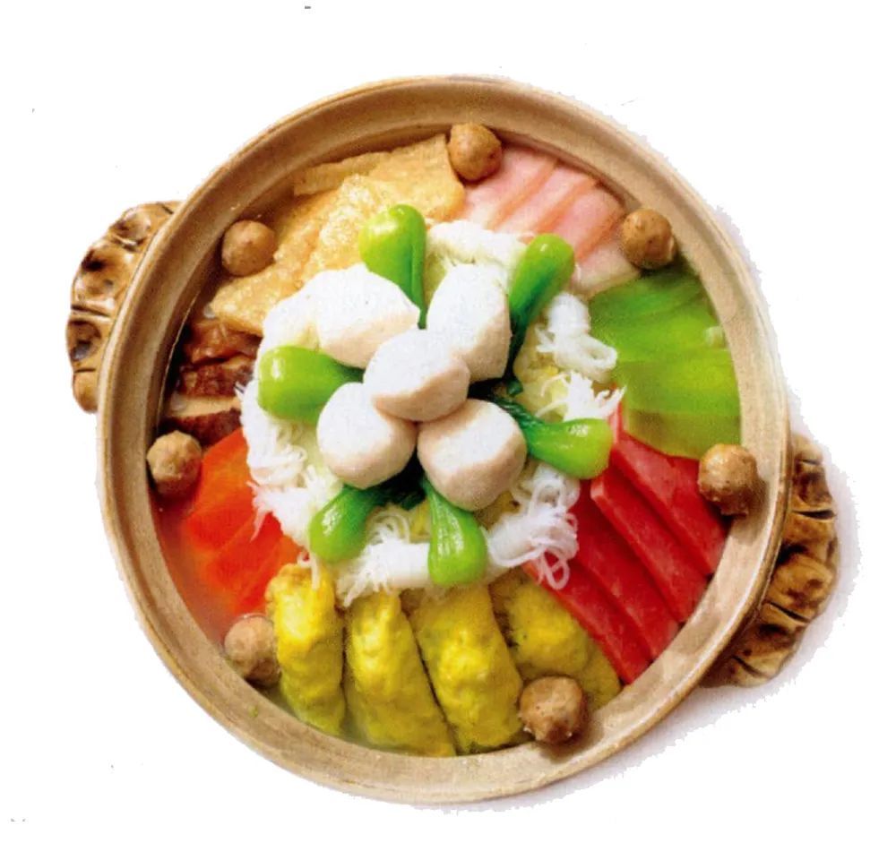 说到“什锦暖锅”的“真材实料”,可不是随便讲讲的,这么多年下来,基本样式变化不大,并持续丰富中。猪骨熬汤或是鲜鸡汤配以线粉和白菜垫底,上面依次摆放肉皮、焯过水的冬笋、蛋饺、咸肉片、肉圆鱼圆等,考究一些的还可放入竹荪、木耳等,加热则一般是电炉,早先也用碳炉。蛋饺和肉圆等都是自家做的,特别是做蛋饺的技艺,是上海人家庭烹饪的必修课。此后随着市场的不断繁荣,许多都可购买半成品。除此之外,食材的摆放也是有讲究的,要沿着砂锅边缘,呈圆圈状,形成层次,寓意向心、圆满,家庭和睦。这道热气腾腾的暖心佳肴,也是许多上海人家逢年过节的必备。