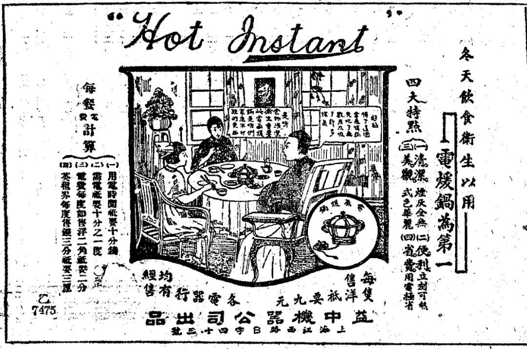 1926年11月28日《申报》刊登的益中机器公司出品电暖锅广告,并配有家庭食用火锅的图案
