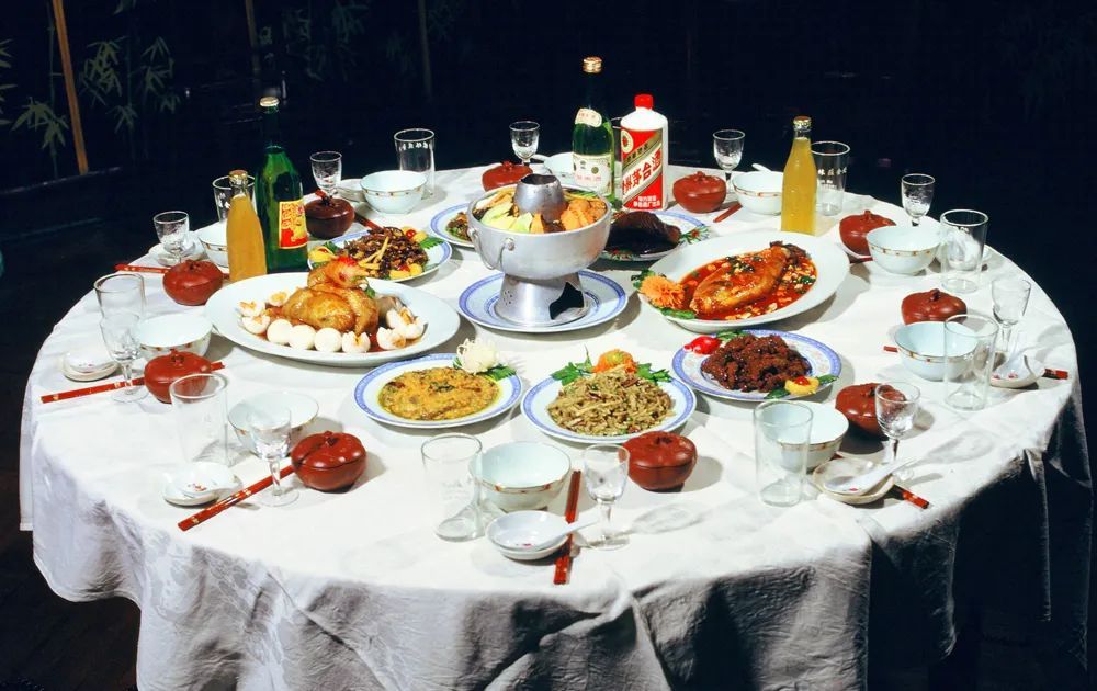 20世纪80年代,上海宴请贵宾的酒席。图中可见茄汁鲳鱼、红烧蹄髈等菜肴,火锅当然也是主角,图片摄影 | 陆杰。