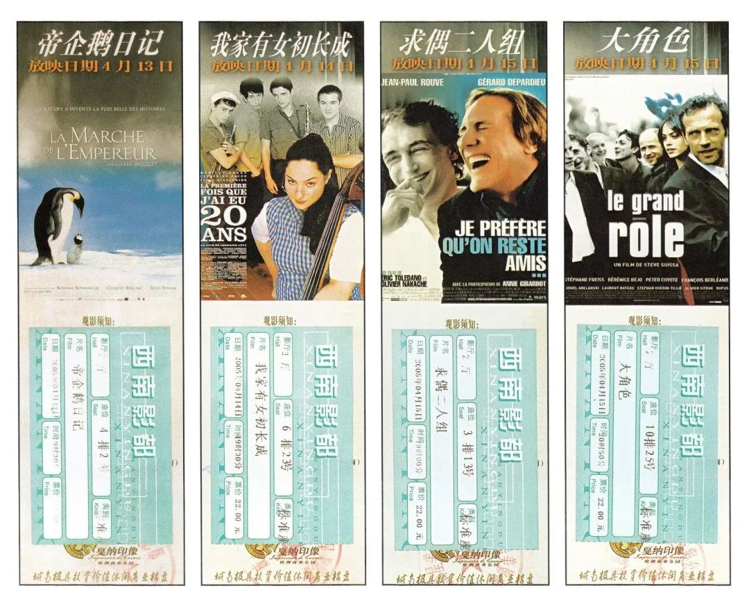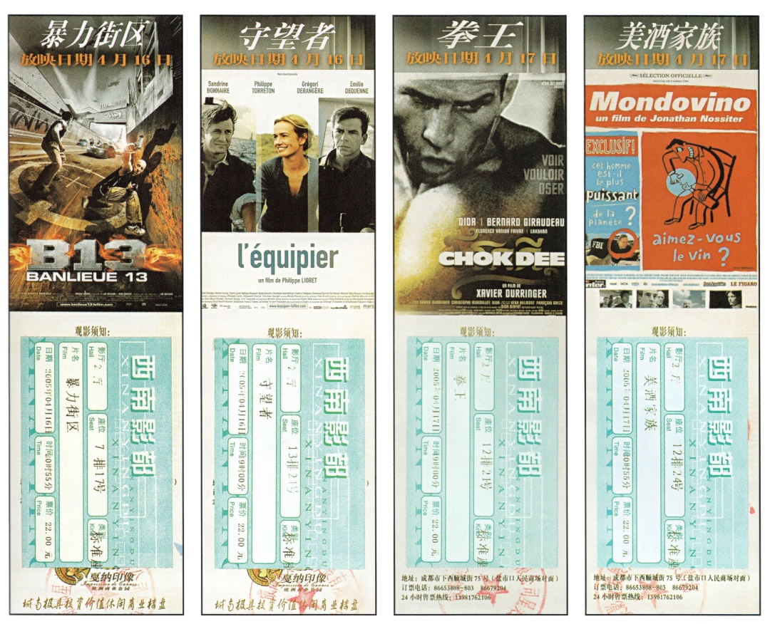 2005年4月13日-17日,戛纳印象 · 欧洲商业公司法国电影展映在程度星美西南影都举行,发行了一套别致的套票,电影的上方为海报,下方应有片名、放映时间、排号和票价。