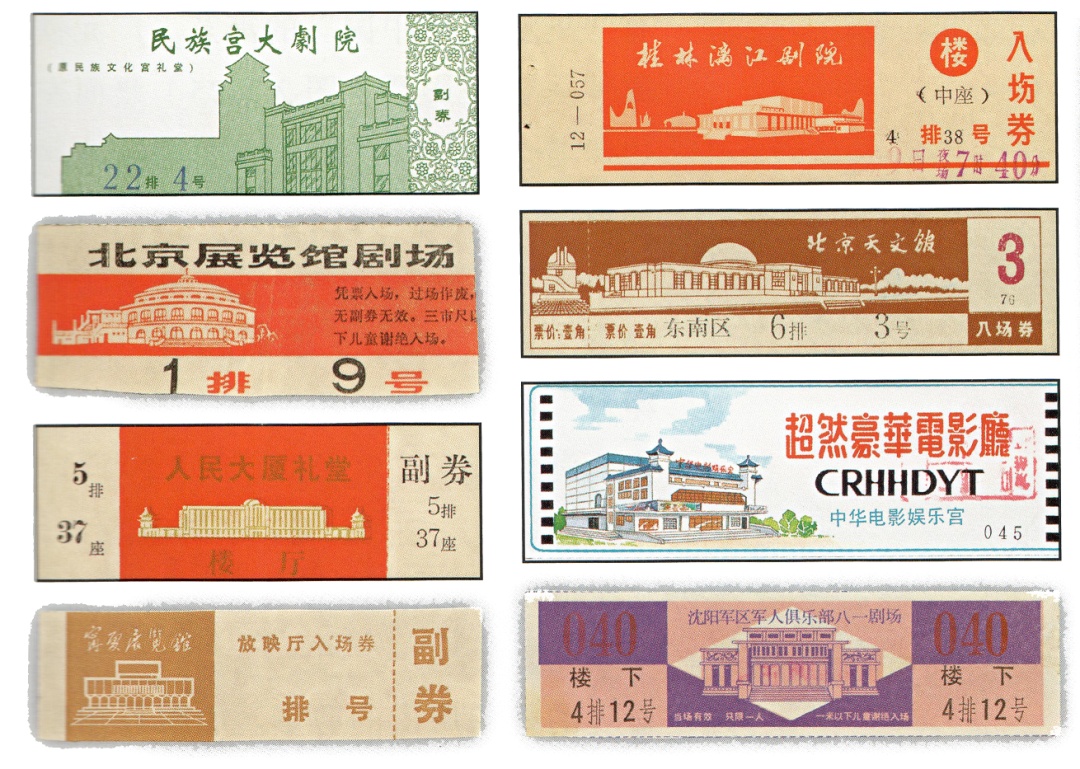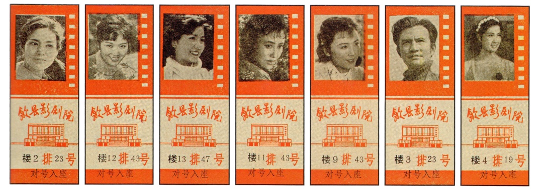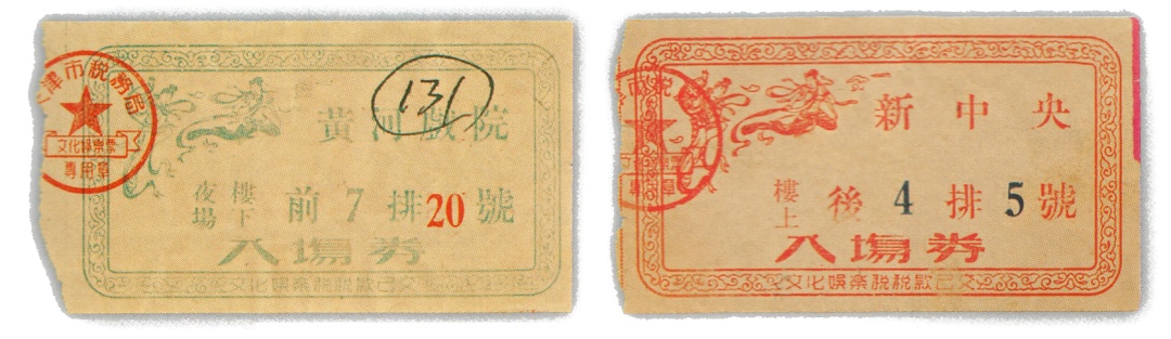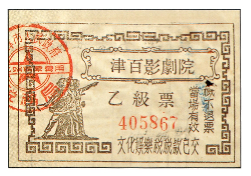在祖国发展的各个历史阶段中,各地所使用的电影票,都打上了深深的时代烙印。新中国成立初期,天津各影戏院的入场券颇具特色,有的印有工农兵雕塑,有的印有敦煌飞天,一般在票上不直接印演出时间和具体排座,而另外印好在收票中临时贴上,每张票均有税务局印章,并注明“文化娱乐税已交”字样。