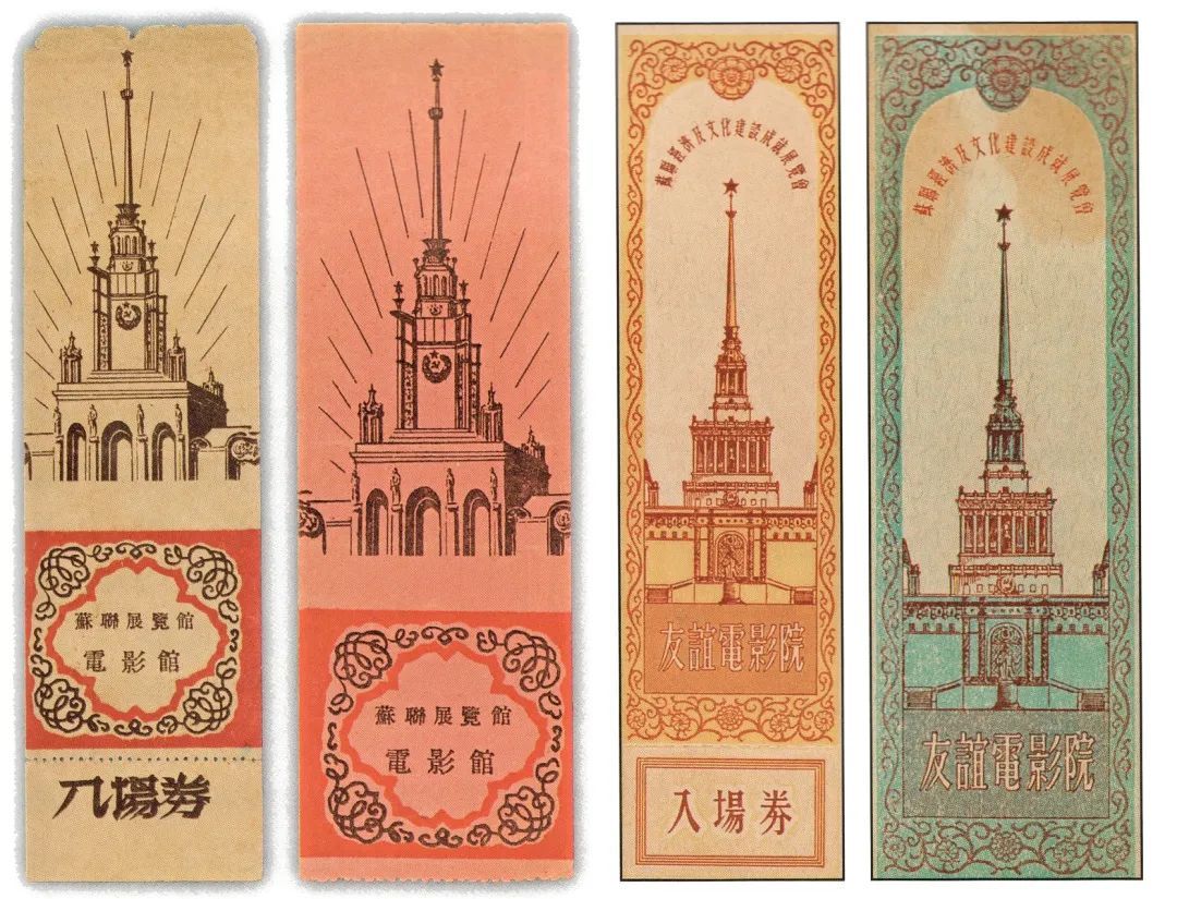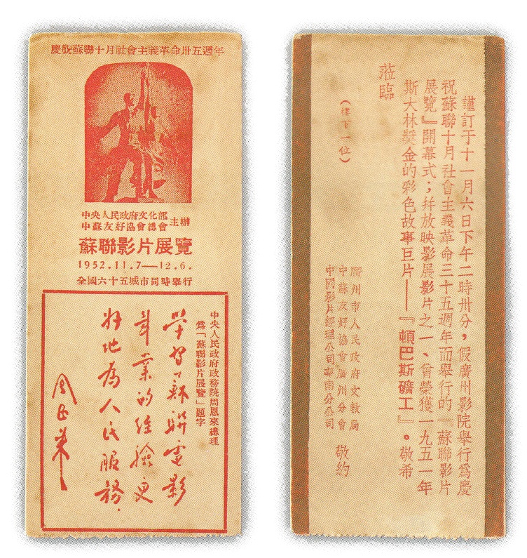1954年10月2日至12月26日,在北京举行了苏联经济及文化建设成就展览会,同时,在上海建立友谊电影院,武汉建立友好电影院。20世纪50年代,前苏联革命影片大大丰富了中国人民的文化精神生活,留存下来的这一张张凝结着中苏友谊的电影票,已深深融入了我们的记忆之中,久久不能忘怀。