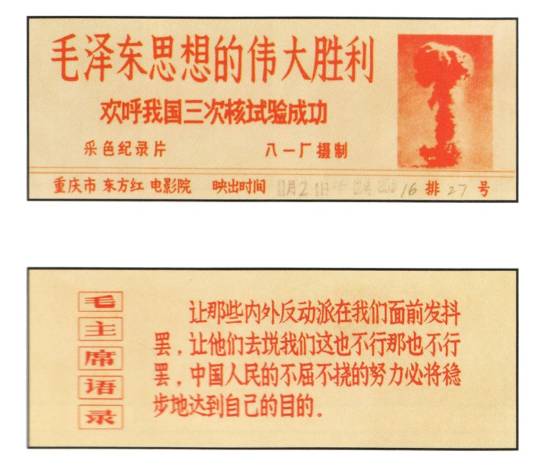 1966年,八一电影制片厂摄制完成了记录我国三次核试验成功的彩色纪录片《欢呼我国三次核试验成功》,于当年11月1日在北京、上海、天津等城市上映。这枚意义非凡的重庆东方红电影院的电影票,真实地记录了纪录片放映的状况。