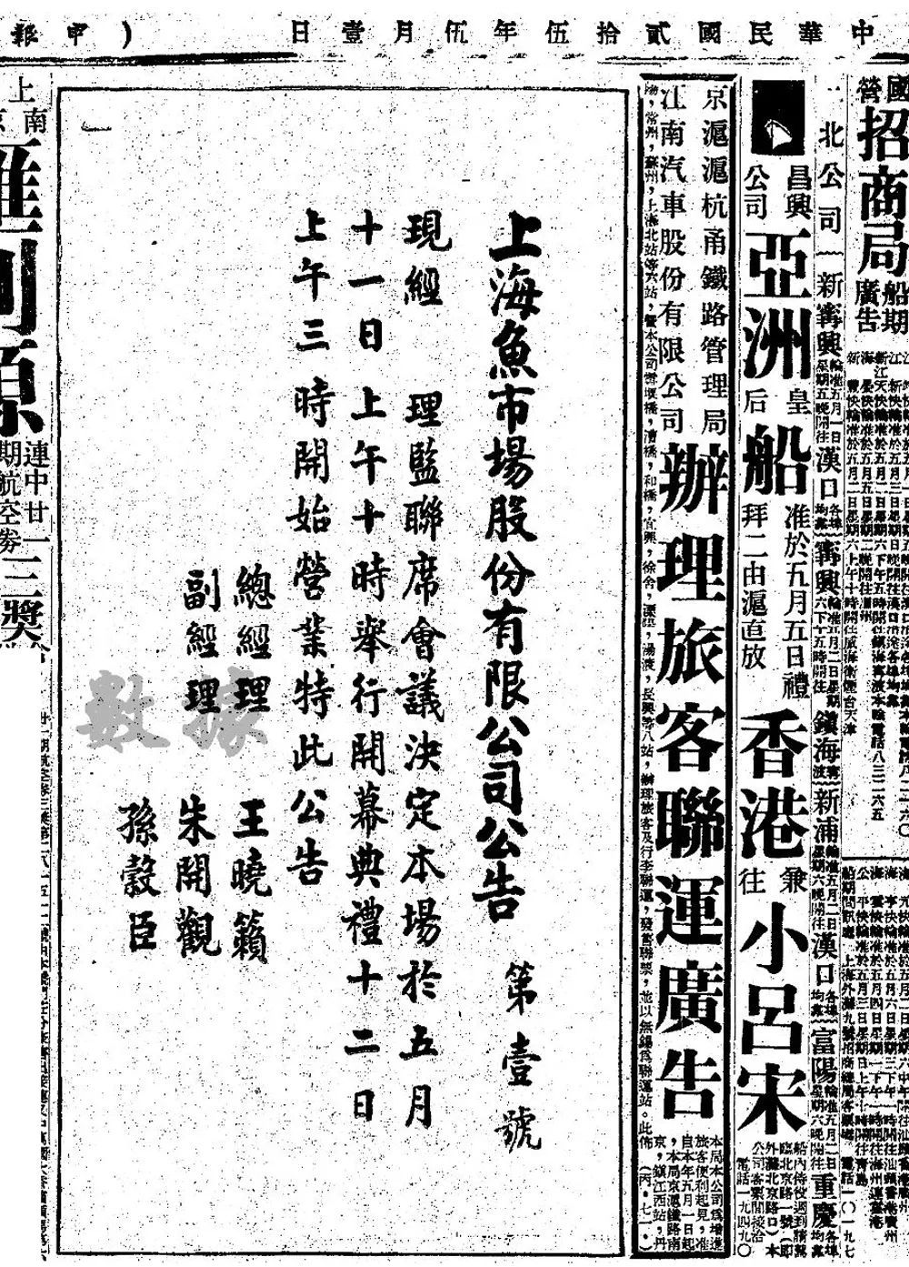 1936年5月1日《申报》刊发上海鱼市场开业公告