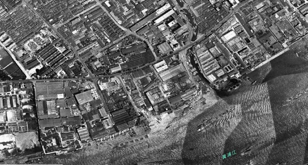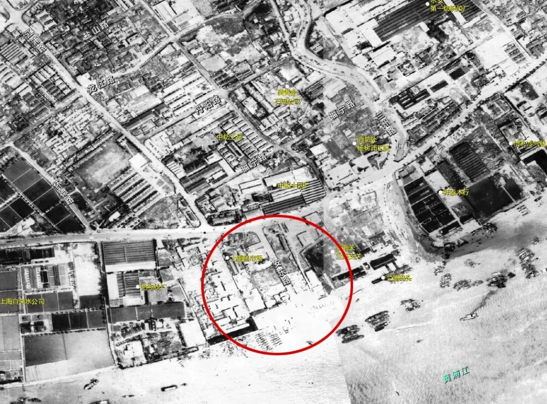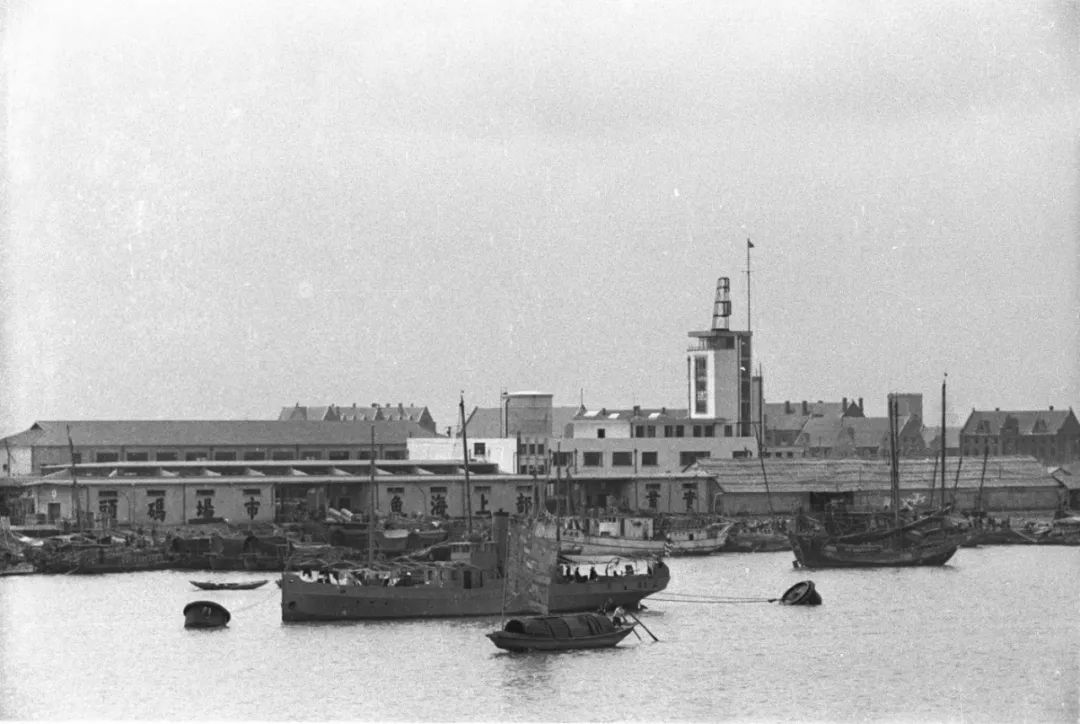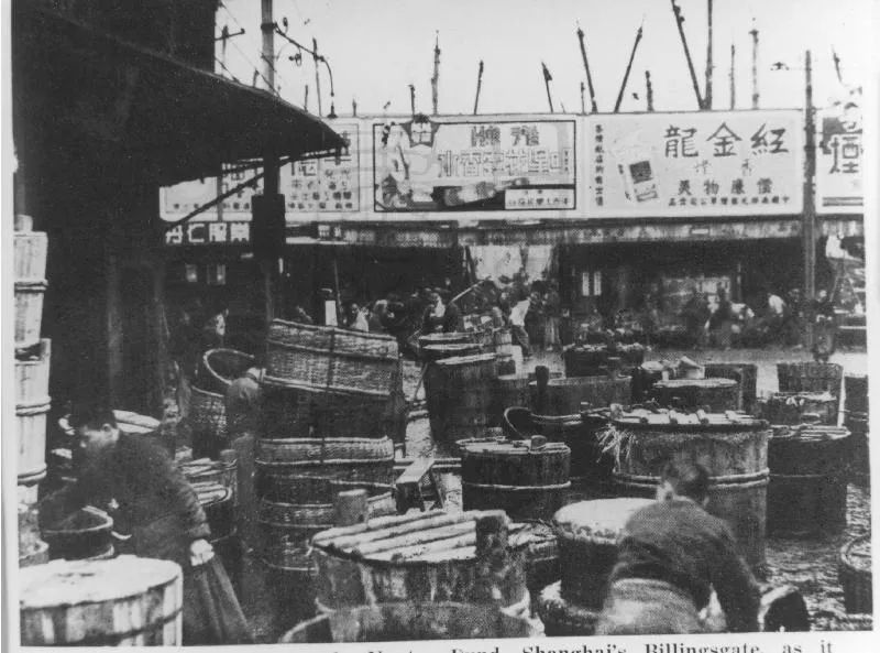 1937年拍摄的上海鱼市场。当时从黄浦江面上望去,“实业部上海鱼市场码头”一排大字十分醒目