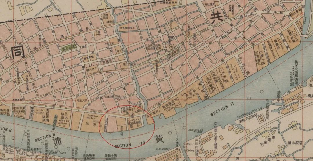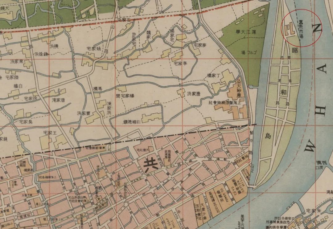 1943年日本绘制的上海市地图。其中标注了“旧鱼市场”和“(新)鱼市场”的位置。值得注意的是,当时日寇将现复兴岛区域标注为“昭和岛”
