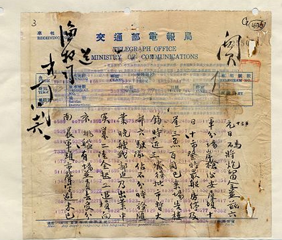 1937年,国民政府与上海市的往来电报。其中详细描述日军侵占上海鱼市场的过程细节