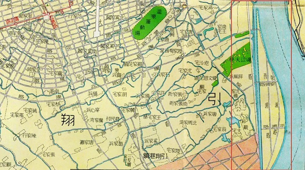 1936年上海市交通图中绘制的现复兴岛区域,当时已有简单的路网,但没有标注岛名