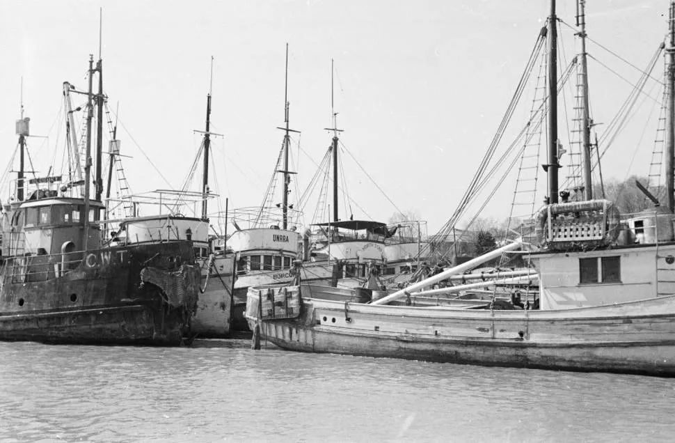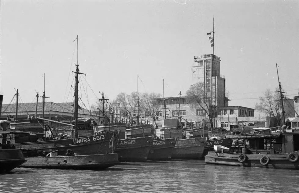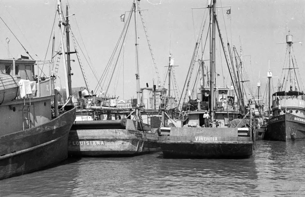 1946年8月,国民政府为接受联合国善后救济总署(UNRRA)的物资,在复兴岛原鱼市场旧址成立渔业善后物资管理处。接受美式渔轮70艘、澳式渔轮56艘(图中可见Jackie Boy、Ocean Queen、Louisiana 、Virginia等船名)并在岛内设后勤设施,初步形成复兴岛海洋渔业基地
