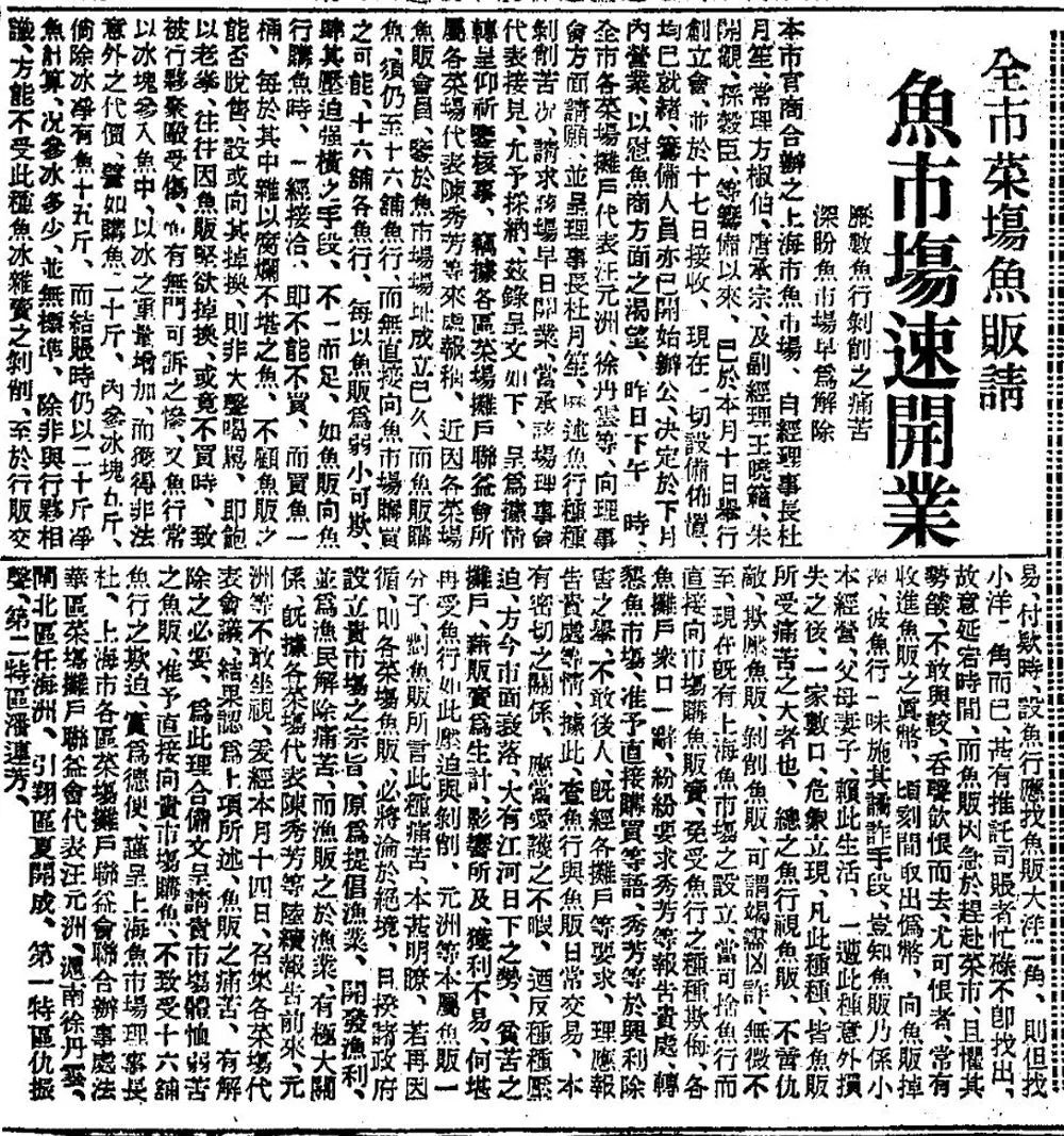 1936年4月19日《申报》刊发一篇题为“全市菜场鱼贩请鱼市场速开业”的报道。副标题为“历数鱼行剥削之痛苦 深盼鱼市场早为解除”