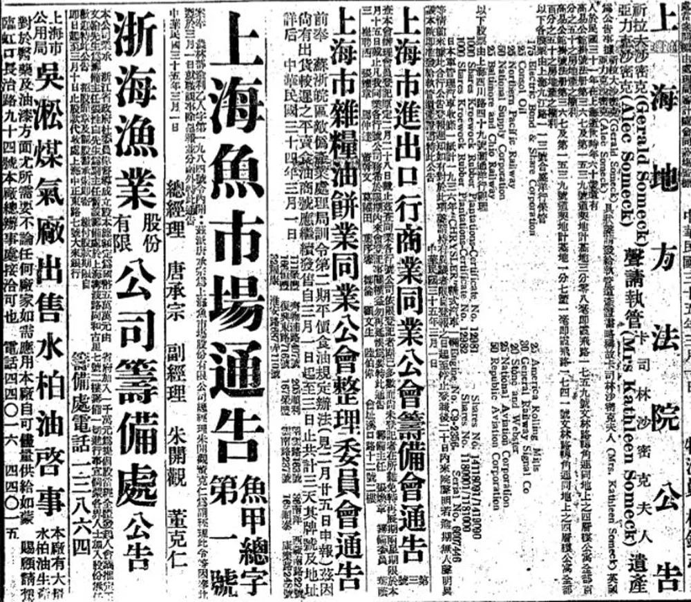 1946年3月1日《申报》刊登的上海鱼市场开业通告