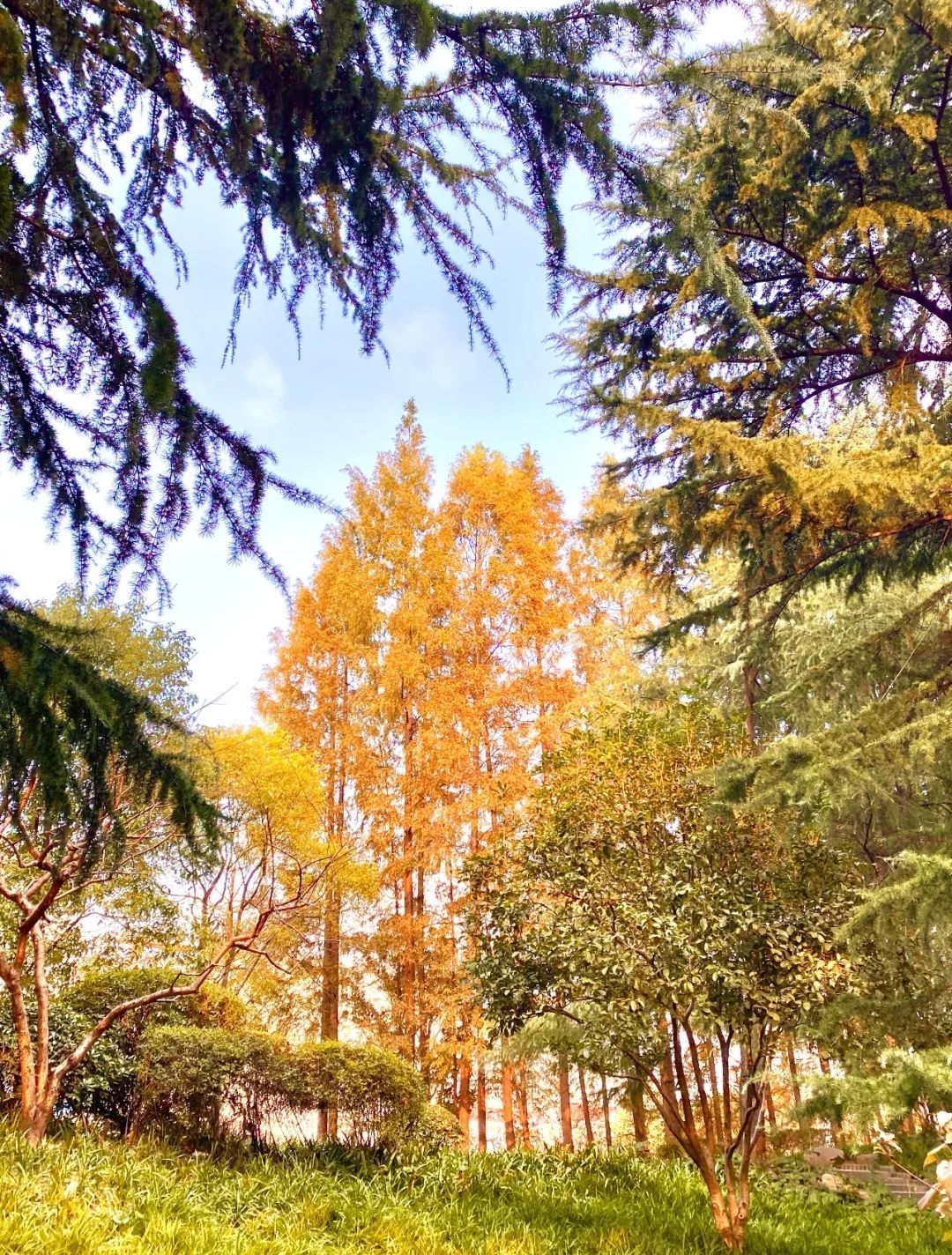 当然秋天也在这里驻足了。不时遇见些红枫或金黄,让绿地更加五彩缤纷。