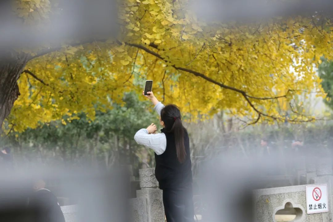 一大早,市民汪女士特地穿上了一件大红色的衣服来到公园,让爱人帮她在树下拍了不少照片。“色彩太漂亮了,我特意来好好‘拗’些造型。这棵银杏树是NO.1,在我心中是最可爱的。”汪女士说。