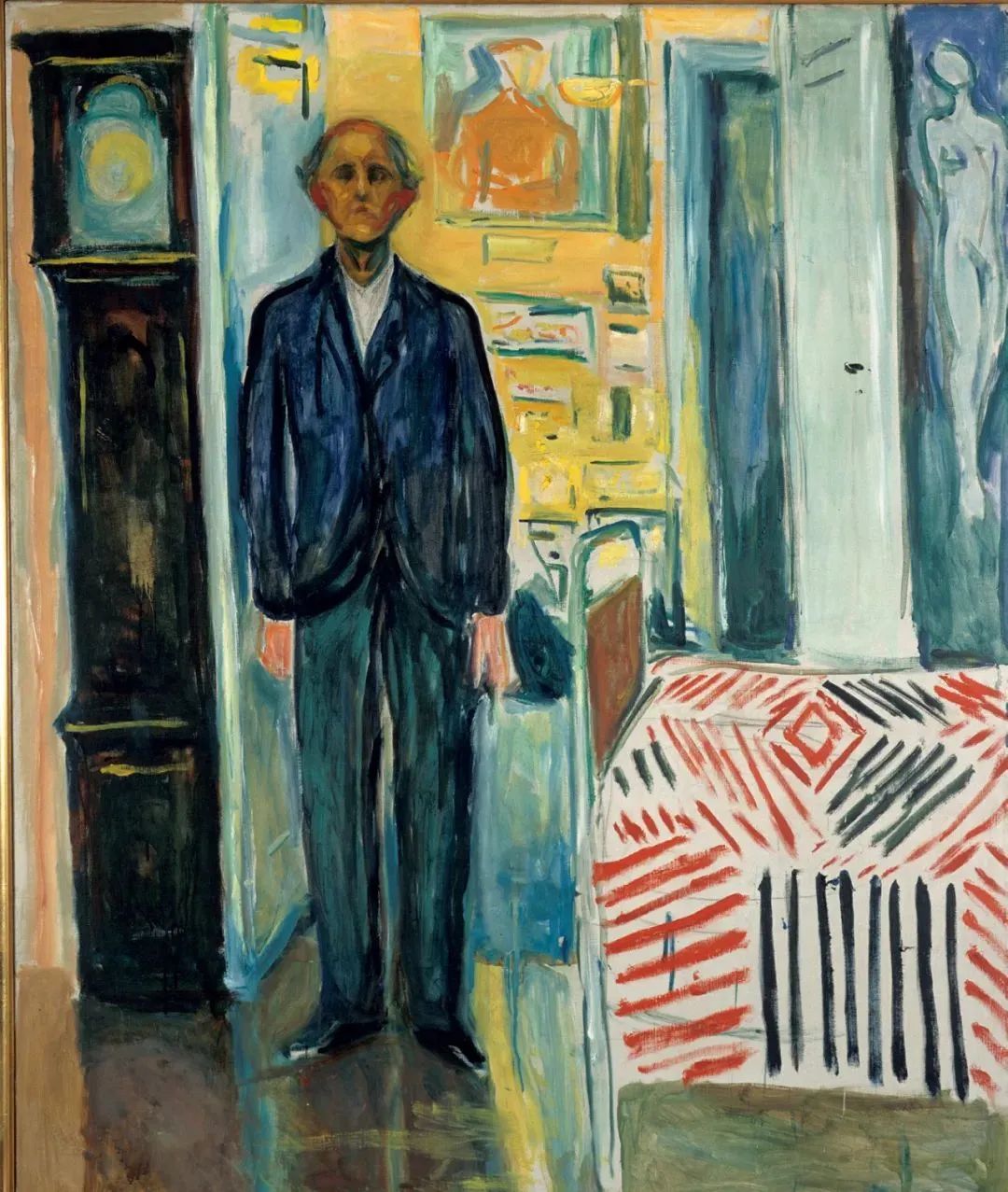 年迈的蒙克站在钟和床之间。斯特纳森描述蒙克“站在卧室的落地钟旁……仿佛在和死亡进行正式的会面”。画家右后方的落地钟看不见指针,但它提醒着我们时间在无情地流逝。房间的背景被涂上了一种可怕的、咄咄逼人的荧光黄。