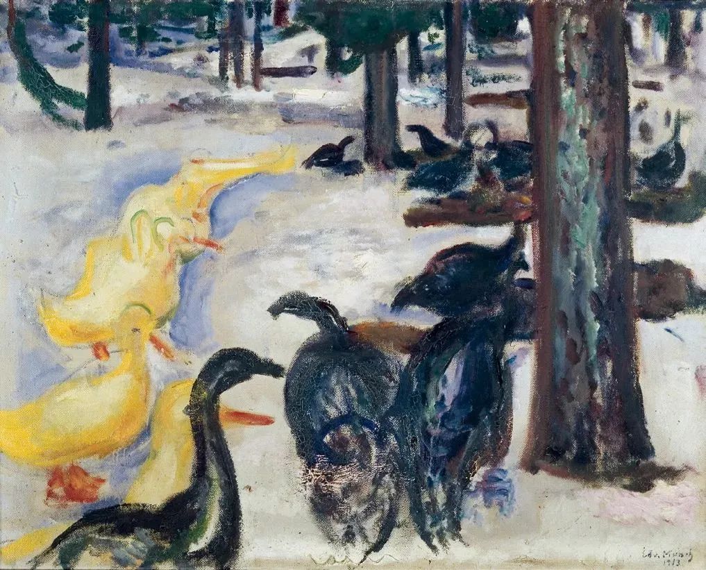 如前文所述,蒙克在赫维茨滕饲养了许多家畜,于是鸭子和火鸡也出现在了他的作品中。蒙克以观察动物们的行为为乐。他对斯特纳森说,他没有画火鸡的鸡冠,理由是“这幅画的红色已经够多了”(第266页)。蒙克把这幅画作为礼物送给了斯特纳森。