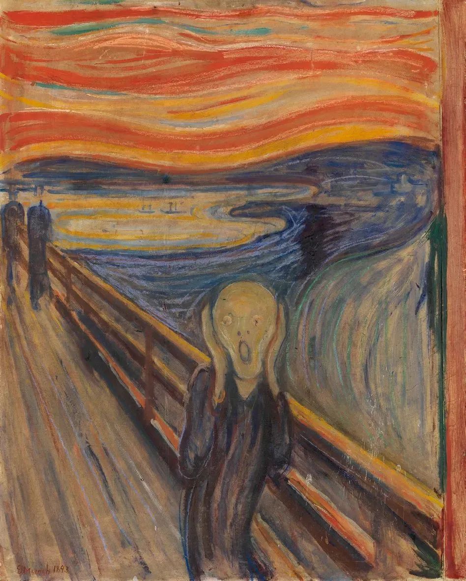 在这幅举世闻名的画作中,蒙克将存在的焦虑拟人化,直接呈现在观众的眼前。我们不清楚这一声呐喊究竟是来自这个噩梦般的人形的嘴中,亦或是那个可怕的人其实正试图用双手保护自己,不让外界传来的喊声传入耳中。斯特纳森称,在《呐喊》中“艺术家通过背景的色彩和线条,对一个内心失衡且高度敏感的人产生压迫”。