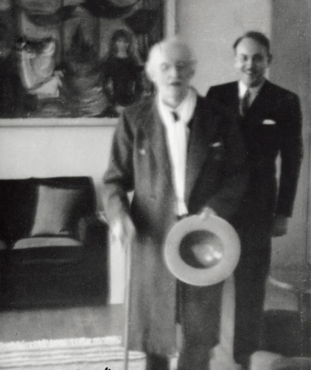 在这张拍摄于1938年的照片中,斯特纳森正在向蒙克展示他实用主义风格的乡间宅邸,主人意气风发,背景墙上挂着的正是蒙克1921年的画作《生命之舞》。在这幅画中,蒙克以阿斯加德斯特兰德的挪威海岸风光描绘了永恒爱情的循环延续。