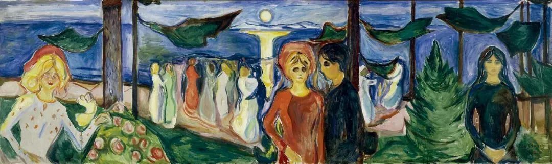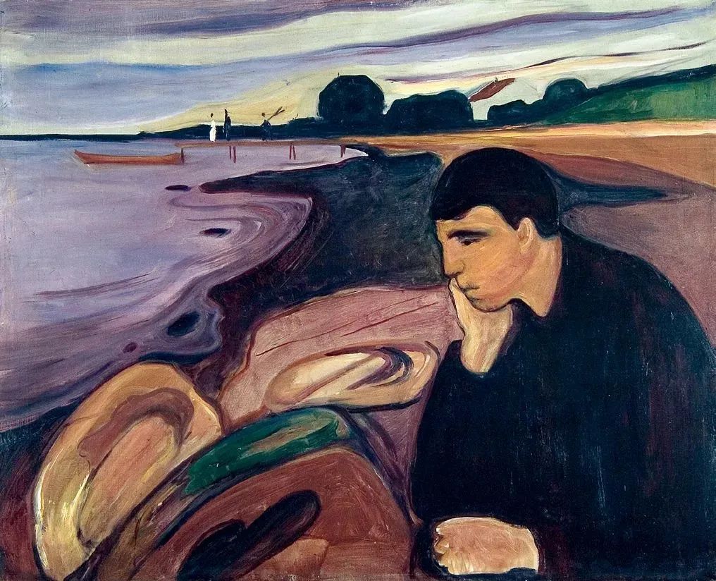 蒙克画了一幅以海滩为背景的画,画中一个沉思的身影坐在夏夜的暮色中。模特是艺术家的密友贾佩·尼尔森,他的坐姿是艺术界常见的传统忧郁姿态。蒙克用柔和起伏的线条描绘了黑暗的海藻,渲染了人物的孤独。斯特纳森解释说,正是在这里,“他在这里找到了最符合自己气质的乡村风景、最适合自己的线条,以及最合得来的人”。