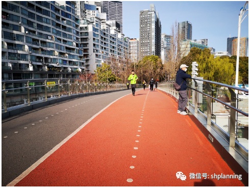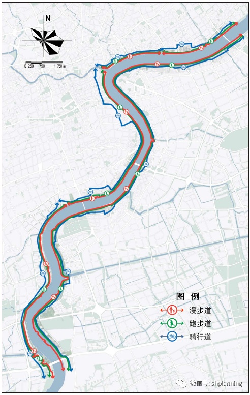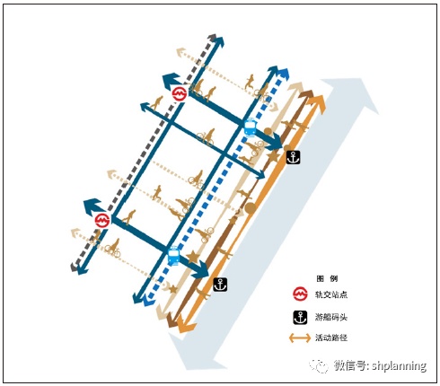 (2)在垂直黄浦江堤岸方向设置更多的慢行廊道,使滨江开放空间与城市公共空间网络相融合,有效“链接”腹地。主要由垂江慢行通道构成滨江联向腹地的活力动线,串联公共交通站点、公共设施节点或公园、广场等大型公共空间。