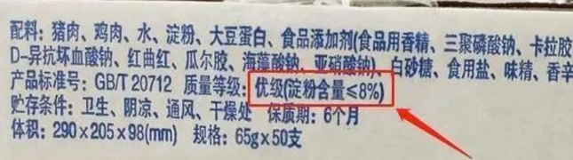 相反,淀粉含量要是大于10%,不管什么牌子的火腿肠都别买,因为这类火腿肠的主要成分基本上就是淀粉了,根本就没啥肉了,我们也称之为“假火腿肠”,不值得购买!