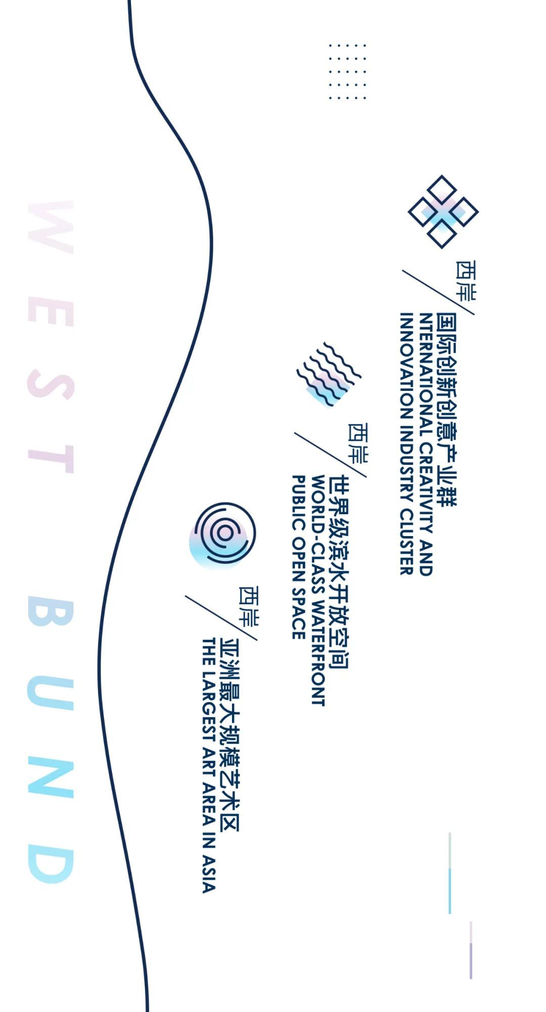 上海西岸是后世博时代起徐汇滨江地区的全新称谓和城区品牌,岸线11.4 km,面积9.4 km²,是上海2035总体规划确定的中央活动区核心承载段。未来,这里将建成世界级滨水开放空间,形成集聚20座高品质公共文化场馆的亚洲最大规模艺术区,构建以西岸传媒港、西岸智慧谷、西岸金融城三大产业互为支撑的国际创新创意产业群,打造迈向全球城市的卓越水岸。