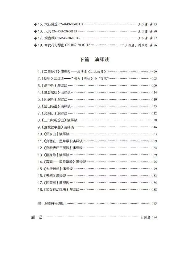 下篇为演绎谈,充分体现出演奏作为二度创作的意义。音乐表演离不开理论研究,演奏水准的提高与学术层面的思考有着密切关联。阅读王老师的这部分文字,会被他缜密的语言表达和理论思维所吸引,这些个人演奏心得之分享,与上篇的乐曲相得益彰,其中不乏关于器乐艺术规律性的总结闪烁着启人心智的真知灼见。另外,笔者作为一名中国音乐史研究者,关注到“演绎谈”中有不少鲜为人知的创作经历,比如采访黎松寿、萧伯青、刘北茂等音乐家,这些具有口述史性质的历史信息,为研究者们提供了珍贵的历史资料。