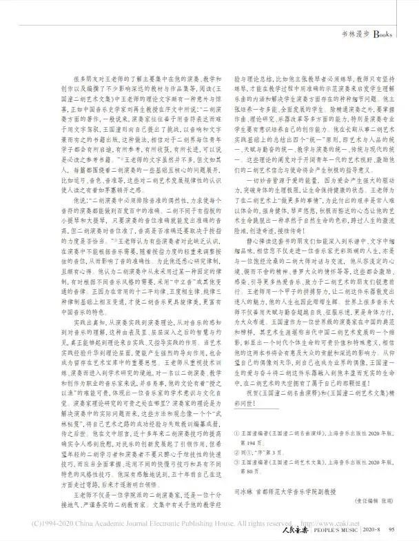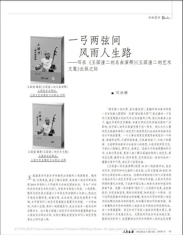 2020年7月,《王国潼二胡名曲演释》《王国潼二胡艺术文集》出版,国宝级二胡大师王国潼将他长期积累的二胡演奏、教学、创作等方面的经验和心得体会,分享给广大读者。该著作一经出版便引起广泛关注,司冰琳《人民音乐》上发表书评,现摘选如下。