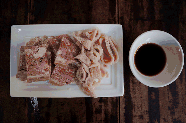 店里的白切羊肉,肉细嫩、膻味少、味鲜美。老食客推荐带皮、带油、带肉的羊五花,蘸上酱油,一整口下去,羊肉、羊皮合着羊油一起,简直赞到爆!