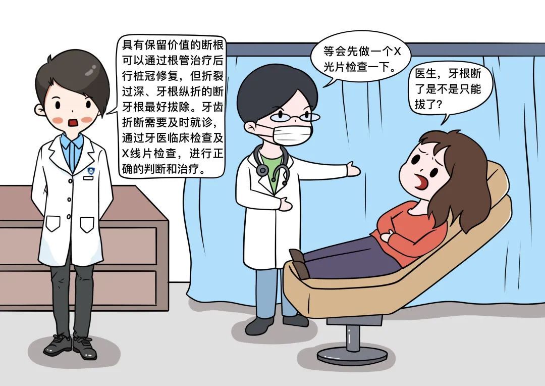 牙根折断的位置、深度、折裂线方向不同,其治疗方案也不相同。具有保留价值的断根可以通过根管治疗后行桩冠修复,复杂的情况可以配合正畸牵引或者冠延长术,这样就利用剩余的断根而不用拔除断了。但折裂过深、牙根纵折等不具有保留价值的断牙根,就最好拔除,以免发炎感染成为病灶牙。牙齿折断需要及时就诊,通过牙医临床检查及X线片检查,进行正确的判断和治疗。