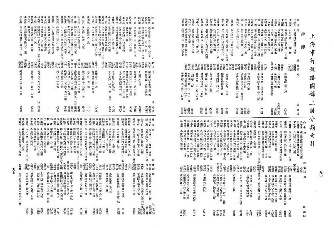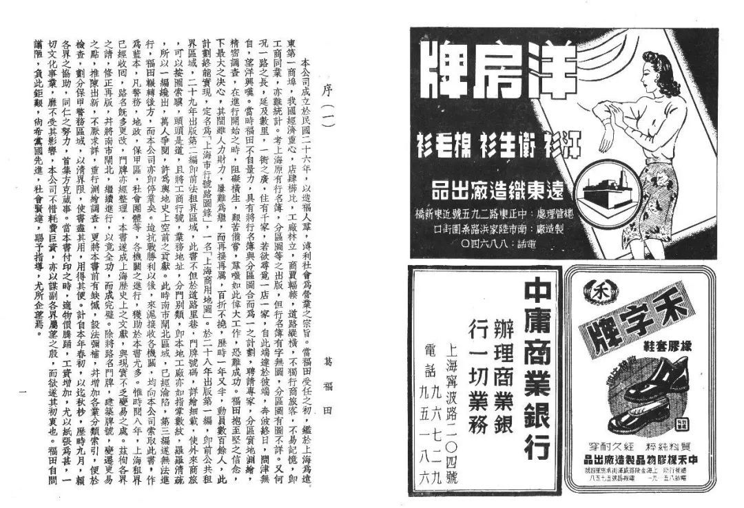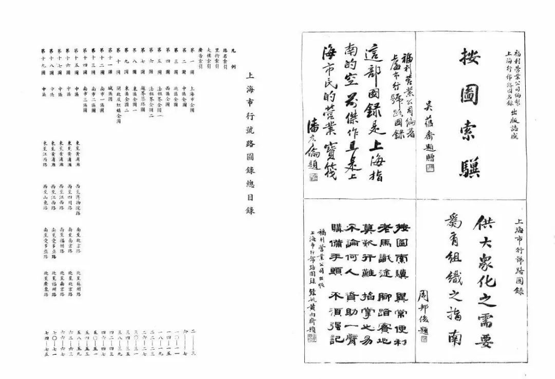 由福利营业股份有限公司出版的《上海市行号路图录》以路图为主,亦称上海商用地图,将行号与地图合为一体,为国内之创举。分幅路图标示了商号、工厂、街道、里衖、大楼的方位,以较大的比例测量并绘制了路图范围内的每幢建筑和每条道路,附有建筑和里衖的门牌号,整座城市可谓了如指掌。由于路名的变化,中外文并不统一,路图中同时标注中文和外文。