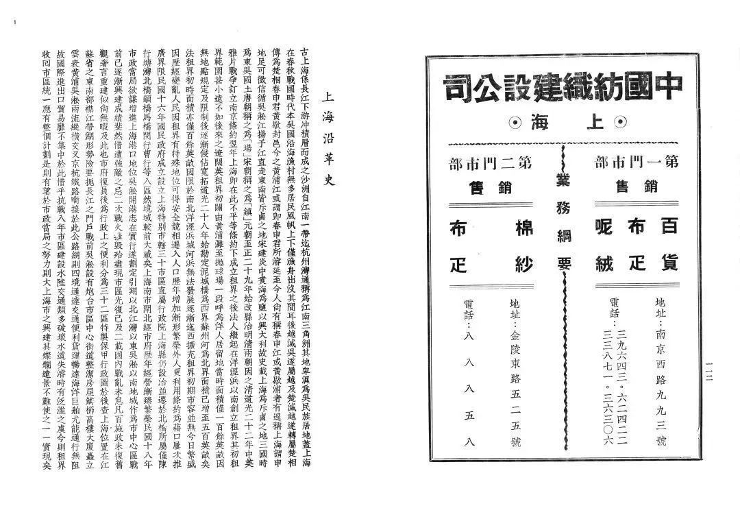 1939年出版的《上海市行号路图录》第一编(第一特区)于1938年春开始编辑,到1939年8月出版,共收录了公共租界的140幅路图和53座大楼图。所谓的第一特区是指公共租界中的中区和西区及公共租界的苏州河北岸地区。这一编图录的分幅路图没有图号和路图索引,但在总目录中列出每幅路图的绘制范围,图录的前面除附有详细的路名索引、里衖坊邨别墅索引、大楼分图索引、广告索引外,还有公共机关和公共团体的索引、医院索引,以及餐馆、旅社、娱乐场所的索引。分幅路图前附有上海市全图、中区总图、北区总图、西区总图、法租界总图、沪西越界筑路图、东区总图、闸北全图、老城厢图(城内图)、南市图等。各幅路图的比例不尽相同,路图中仅有指北针而没有比例尺。